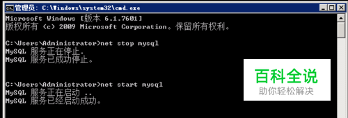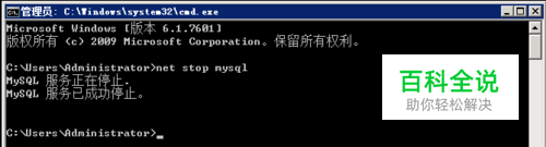 停止MySQL服务(方法一)。 进入dos窗口: c:\>net stop mysql 注意:此命令可执行成功的前提是mysql服务已经注册,否则无法以通过此命令停止mysql服务。