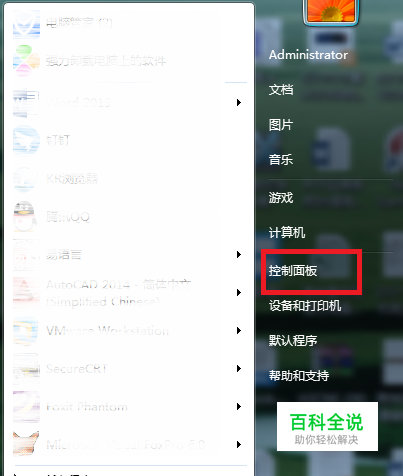 按键盘开始键,弹出开始菜单,选择“控制面板”