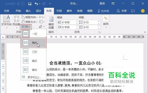 单击“布局”选项卡;单击“页面设置”组中单击“栏”按钮,在弹出的下拉列表中选择“两栏”。