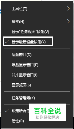 首先对着任务栏右键,选择“显示触摸键盘按钮(Y)”,带触摸屏的PC默认开启触摸键盘按钮,可直接跳过