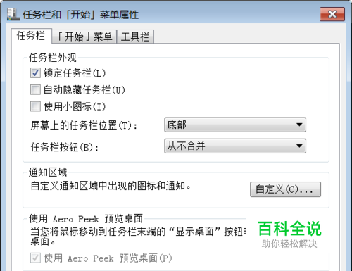 将鼠标指针移动任务栏的空白处,右击--弹出的快捷菜单中选择“属性”命令