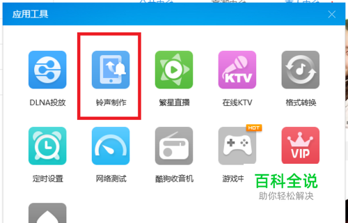 这里我们所剪辑铃声的时候必须要用到的是一个辅助性的软件,这里小编就运用了最为简单的铃声剪辑软件,就是我们的酷狗音乐,首先打开酷狗,然后选择如下图中所示的红色部分也就是工具。