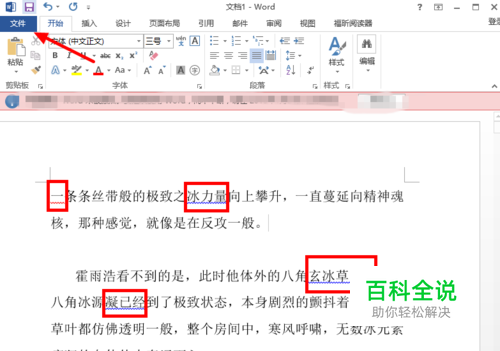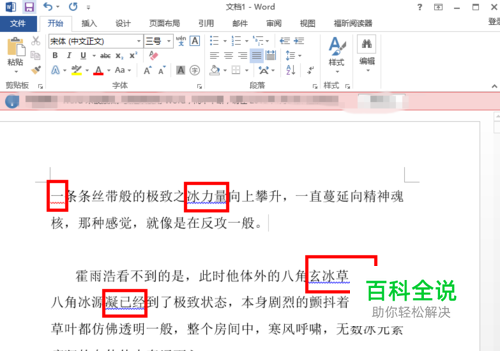首先打开一个Word2013文档,小编用红色方框把有红色或蓝色波浪线的地方圈起来。