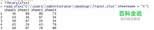 该包安装成功后,就可以导入excel表格了,编码为: > library(xlsx) > read.xlsx("C:\\Users\\Administrator\\Desktop\\lianxi.xlsx",sheetName = "1")