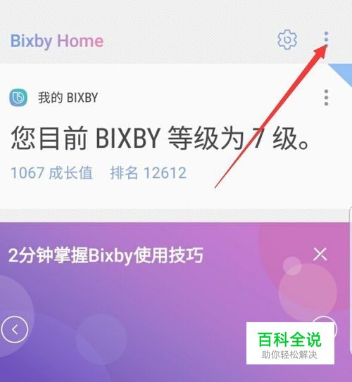 按手机左侧的bixby按键,会打开bixby页面,如图所示,点击页面右上角的图标,会弹出更多选项。