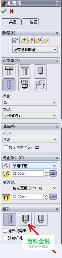 首先编辑异形孔特征,在选项框最下端选项一栏,看是否选择的是第二项