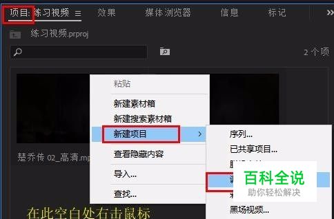 2、在“项目”面板空白处右击鼠标,选择“新建项目”-“调整图层” 点击“确定”,新建调整图层