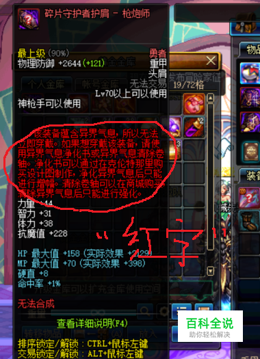 第五,鼠标右键点击“异界气息净化书”,之后,鼠标会变成小手,这是就左键点击你需要净化的带红字的装备