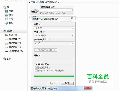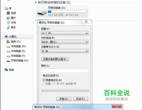 弹出对话框这里一般用默认的格式FAT32,选择快速格式化。 如图