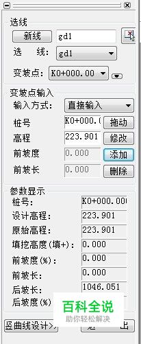 设计拉坡线、竖曲线:新增拉坡线,设置变坡点,设计竖曲线; 【道路断面法】-【拉坡竖曲线设置】 拉坡设置:添加/删除变坡点,对其进行高程修改或自由拖动修改; 竖曲线设置:选择计算方式,确定对应变坡点的竖曲线。