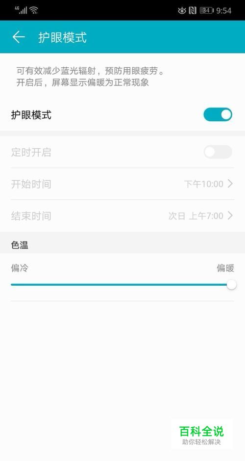 将护眼模式右边的键往右滑动,开启后,激活下面色温进度条。