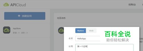 云端创建应用:APICloud提供了两种应用创建方式,方便开发者在云端和IDE中创建应用 注册并登录APICloud系统:点击左上角“创建应用”, 如图:选择“Native”,填写“名称”及“说明”,应用创建完成。