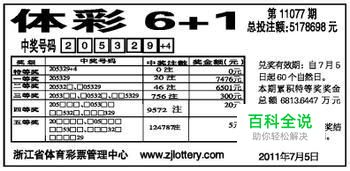 中国体育6+1彩票每注2元,由6位数彩票号码及一个特别号码组成,特别号码范围为(0- -9)。开奖时摇出一组六位数中奖号码以及一个特别号码。购票者可选择机器选号或自己选号。销售员将彩票号码和其他参数逐一打印在彩票上形成有效彩票交购票者作兑奖凭证。同一台电脑每注号码每期限售一次,即单机不重号。购票者购得彩票后不能无故要求撤消或更换。彩票当期有效,不记名,不挂失,不流通使用,不返还本金。