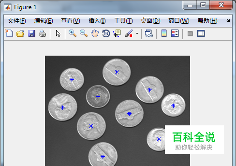 Img = imread('coins.png'); % coins.png为系统内自带图像 Ibw = im2bw(Img); %使用阈值变换法把灰度图像转换成二值图像 Ibw = imfill(Ibw,'holes'); %该函数用于填充图像区域和‘空域’ Ilabel = bwlabel(Ibw); %连通区域标记函数 Area_I = regionprops(Ilabel,'centroid');%用来度量图像区域属性的函数.常用来统计 %被标记的区域的面积分布,显示区域总数 figure;imshow(Img);hold on;