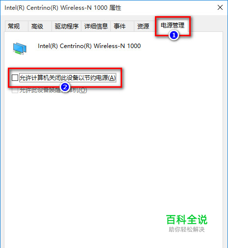 在打开的无线网络适配器的“属性”窗口中切换到“电源管理”选项卡,取消勾选“允许计算机关闭此设备以节约电源”,点击确认后退出;重新启动计算机,查看问题是否解决。