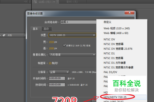 打开AE创建新的合成组,将预置设为:HDV/HDTV 720(持续时间:3秒)