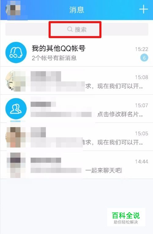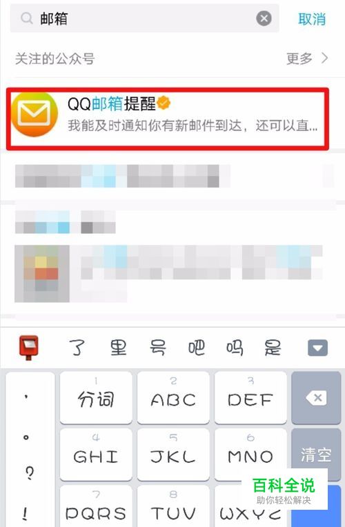 在手机登录QQ账号之后,在 消息界面点击顶部的【搜索】,然后在搜索栏输入【邮箱】搜索一下。 如图所示