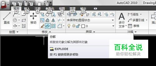 AutoCAD是一款非常常用的绘图软件,可绘制各种各样的工程图形,有这多样的功能。在有些时候我们需要选取某一复合图形的一部分,例如是一个矩形的某一条边,但我们不能单独选择一条边,只能选择整个矩形,这时候就要用到分解这个功能了。
