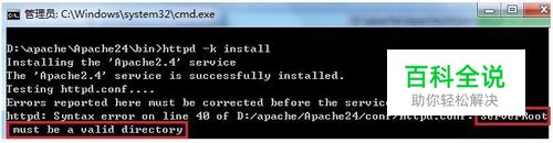 【现象】 D:\apache\Apache24\bin>httpd -k install Installing the 'Apache2.4' service The 'Apache2.4' service is successfully installed. Testing httpd.conf.... Errors reported here must be corrected before the service can be started. httpd: Syntax error on line 40 of D:/apache/Apache24/conf/httpd.conf: ServerRoot must be a valid directory