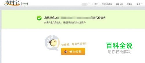 在新弹出的页面中 一、在“我知道是在为他人付款,商品或服务不归我所有,如产生退款,将退到对方支付宝账户!”前面打勾。 二、确认付款。 注意:我知道是在为他人付款,商品或服务不归我所有,如产生退款,将退到对方支付宝账户!