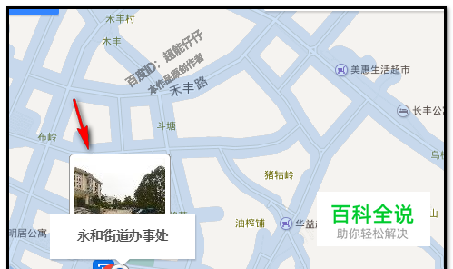 现在,想看下“广州市黄埔区永和街道办事处”的街景,怎样操作呢。 这时,大家把目光放在地图的右下角这里, 这里显示着一张小图,并写着“全景”