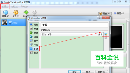 打开虚拟机VirtualBox,在“管理”——“全局设定”——“扩展”