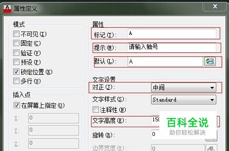 执行“创建属性”命令(ATT),系统将弹出“属性定义”对话框,在“标记”文本框中输入“A”,在“提示”文本框中输入“请输入轴号”,在“默认”文本框中输入“A”,“对正”选项选择“中间”项,将“文字高度”改为150。