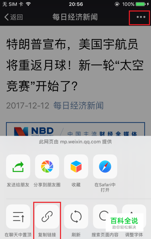 在需要截图或保存的微信文章界面,点击右上角“三个点”微信菜单,在弹出的菜单里选择“复制链接”。