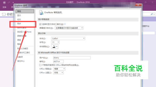 弹出OneNote选项界面,在左侧菜单栏中找到【同步】并点击,如图: