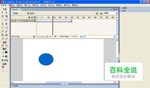 我们用画圆工具在工作区画一个圆。大小随意。形状不用是正圆,椭圆也可,你看到刚才 的空白关键帧的标记变成了实心。这个就是关键帧了。关键帧就是表示这一帧是形成动画的关键动作。