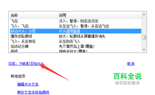 同样的方式设置片尾,字幕为THE END。在片头、片尾和正片之间也分别添加过渡效果。制作完成后,单击完成。