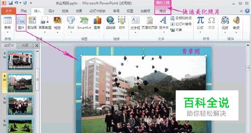 接下来就可以把所有的照片都插入到PPT文档中。单击菜单栏“插入”选项,选择插入图片,把照片都插入到每一个幻灯片页面中,并调整好照片在幻灯片页面的位置,还可以选择图片工具美化照片。