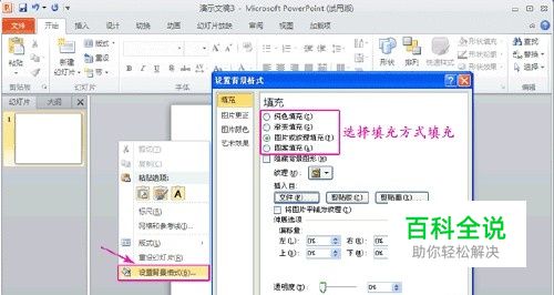 打开Powerpoint,为空白PPT设置一个背景,这样看起来就不会太单调。鼠标右键单击选择“设置背景格式”,背景可以选择图片或颜色填充。
