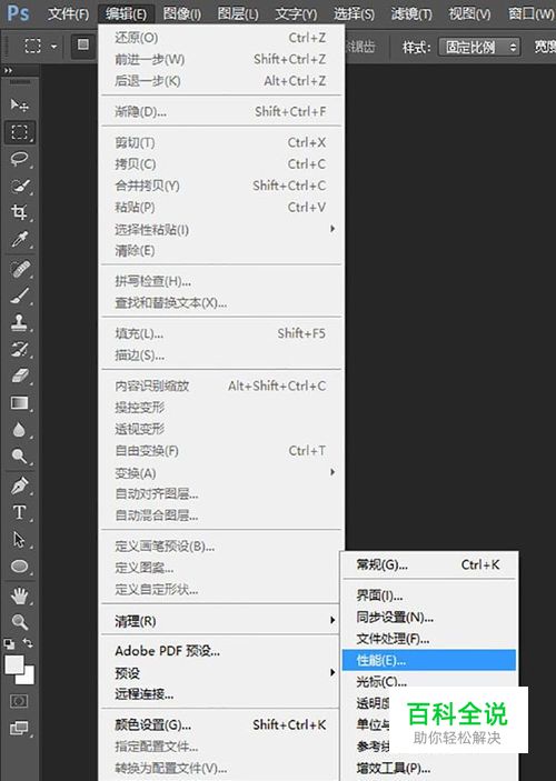 首先打开“性能”选项,位置:“编辑”——>“首选项”——>“性能” 适当增加Photoshop内存使用量可以增加软件运行效率,前提是电脑拥有足够内存容量,默认60-70%其实就很够用。当然很多电脑内存只是刚刚够用 这样子,处理照片还会打开浏览器、聊天工具什么的,这时就要考虑压缩Photoshop内存用量,给其他软件预留空间。另外,如果平时Photoshop 使用率不高,而且只是做一些简单处理,那么也可以适当压缩Photoshop内存用量。