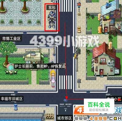 到达炘南位置的路线图如下: 在小区街道找东衫接取任务后,往下走,在十字路口处向右走,进入幸福小区,如图: