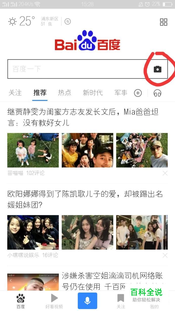 打开手机百度APP之后,在搜索框的右边找到一个类似相机的图片,然后点击进入下一个操作。