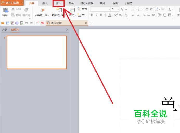 首先,打开一个WPS演示文稿,在上方的菜单栏中,点击进入“设计”的功能分组。