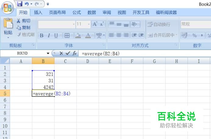 之后我们在这组数字下方的单元格中输入=averege(B2:B4),然后我们按回车键;