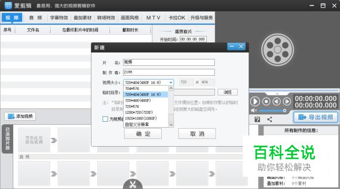 打开爱剪辑,出现新建对话框,设定编辑的视频片名,大小等然后点击确定,在双击左下角的’双击此处添加视频‘,选择素材。