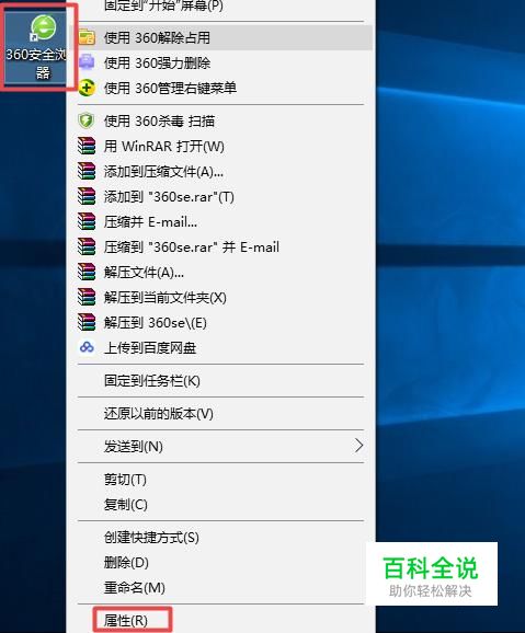 首先,我们在电脑上面找一个需要修改图标的软件,此处我们选择360安全浏览器,然后我们右击选择属性;