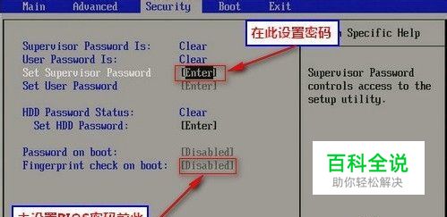 在主页面将光标移到“Set Supervisor Password(超级管理员密码)”回车,在出现的窗口中输入密码并回车,在出现的窗口中再次输入同一密码并回车,CMOS便回将密码记录下来并返回主页面。