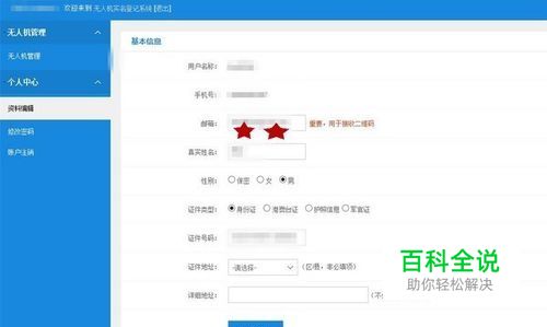 登陆界面后,他会自动跳转到用户信息内容部分,按顺序把手机、姓名、身份证号及家庭住址等信息填写完毕,但是一定要注意邮箱~!一定一定要留一个有效的邮箱地址,这个是接收无人机二维码标签的唯一通道 填写完毕后,点击保存修改即可。