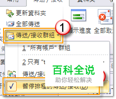 然後請按一下【傳送/接收群組】,並且取消勾選【暫停排程的傳送/接收】。