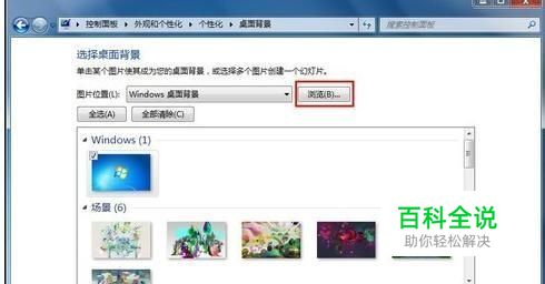 这里已经有很多Win7自带的精美主题包,第一栏“我的主题”中列出的是我们下载安装或自定义的主题包。 不管你现在使用的是什么主题,点击个性化窗口底部的“桌面背景”,切换到选择桌面背景窗口,点击图片位置右侧的“浏览”,选择你存放靓照的文件夹。
