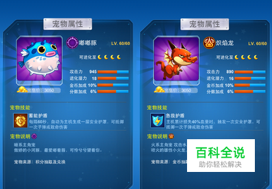 2.技能对比 嘟嘟豚和炽焰龙的技能都是一样的,护盾,抵挡一次子弹或者致命伤害。但是重点就是触发的条件了。嘟嘟豚的技能触发是按时间来的,60秒生成一 个,而炽焰龙的触发条件是主机累计损失40%血量时触发。就从这两个条件来看嘟嘟豚的触发条件算是比较简单的,如果炽焰龙不搭配回血宠物的话那是很难有生 存能力的。