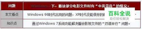 所谓“双语并行”,其实就是播放影音文件时,从音箱里同时传出中文和英文(或是国语和粤语)。在Windows 98时代,由于影视文件的压制方法的问题,用户却无法通过系统或播放软件本身予以调解。即便是后来的Windows XP,这个问题依然未能很好的解决。现在,同样的问题在Windows 7下就可以很好的解决了。