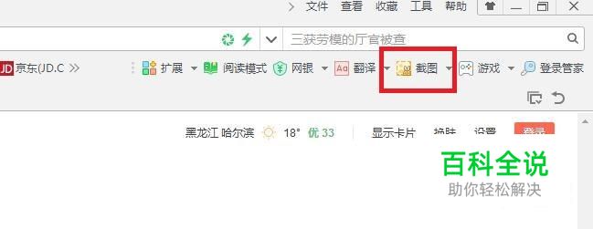 打开360浏览器,点击浏览器右上方“截图”,打开下拉菜单,如图所示
