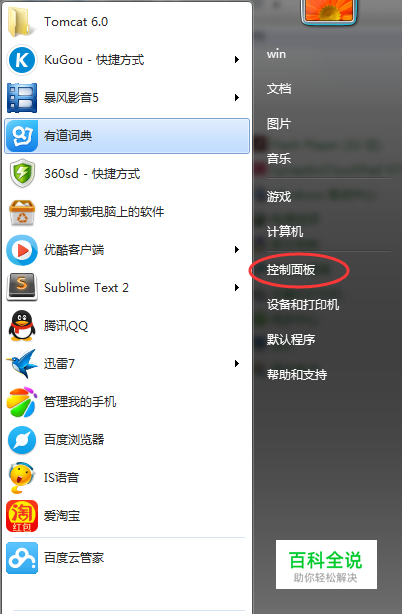 打开控制面板。 点击开始按钮,选择控制面板。