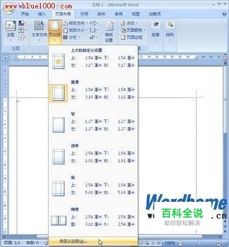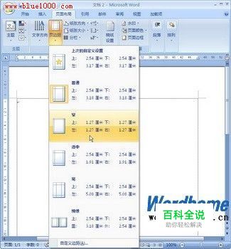 方式1:打开Word2007文档窗口,切换到“页面布局”功能区。在“页面设置”分组中单击“页边距”按钮,并在打开的常用页边距列表中选择合适的页边距,如图所示。