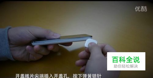 接着把开盖拨片尖端插入开盖孔,按下弹簧锁针借助开盖拨片将后盖轻轻挑开,接下来用拨片边缘沿细缝将背盖划开完整一圈